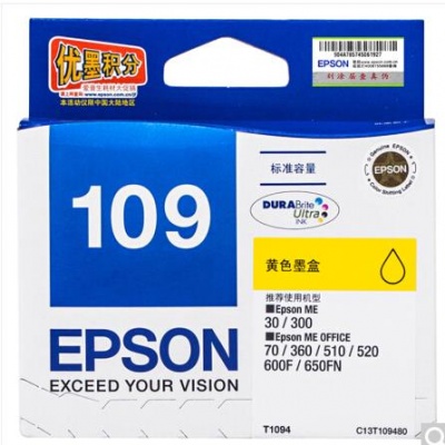 • 商品名称:爱普生(Epson)T1094黄色墨盒 C13T109480(适用ME30/300/360/510/600F/650FN/700FW)
