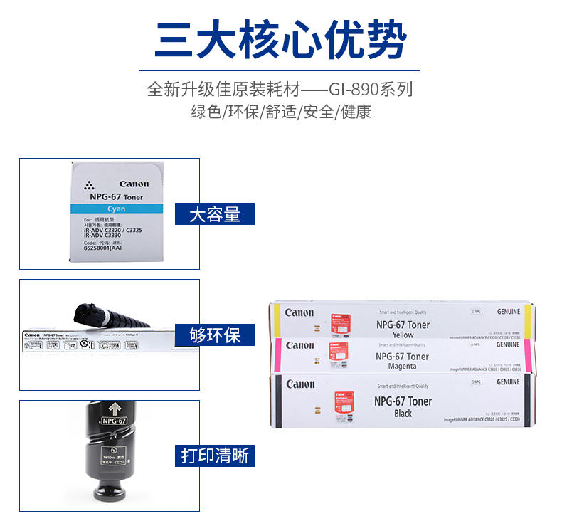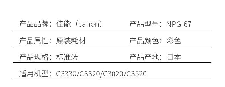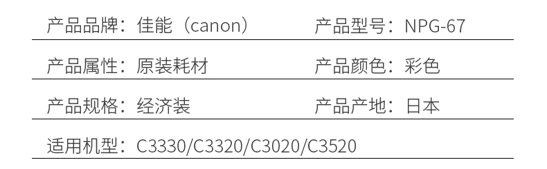 • 商品名称:佳能(Canon) NPG-67 经济装黑色墨粉/碳粉/粉盒 适用 C3020/3320/3520