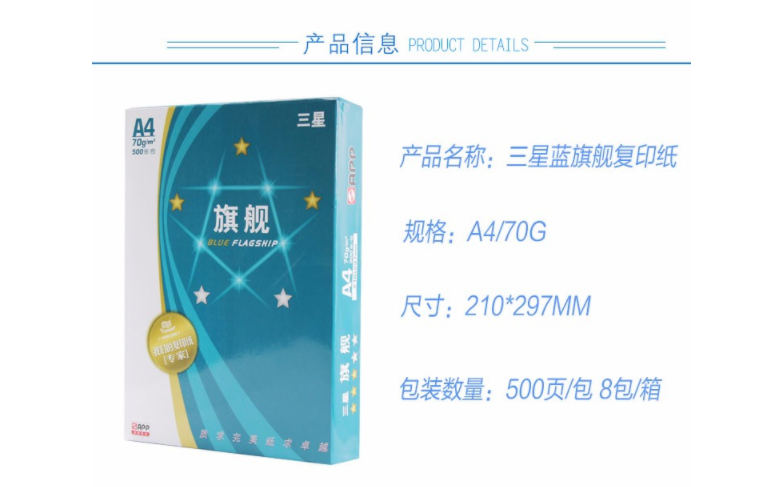 • 商品名称:五星蓝旗舰打印纸 规格:A4/70G 尺寸:210*297mm 500页/包 8包/箱